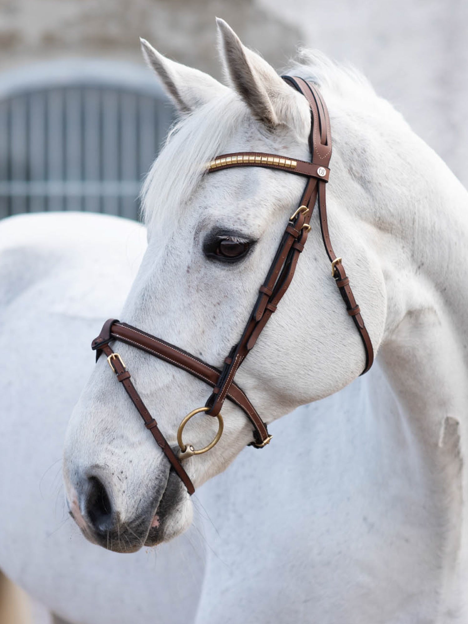 California är vårt Aachenträns i mjukt oljat vegetabiliskt garvat läder med fodrad nosgrimma och nackstycke. Med tränset följer ett pannband med klinker i mässing. Tränset har mässingfärgade spännen och ljusa dekorsömmar. Aachenträns är ett av de vanligaste tränsen till häst och det består av en övre nosgrimma och en undre snokrem. När man sätter på det övre nosgrimman placeras den cirka två fingrar under hästens kindben och justeras så att det är möjligt att placera minst två fingrar under.