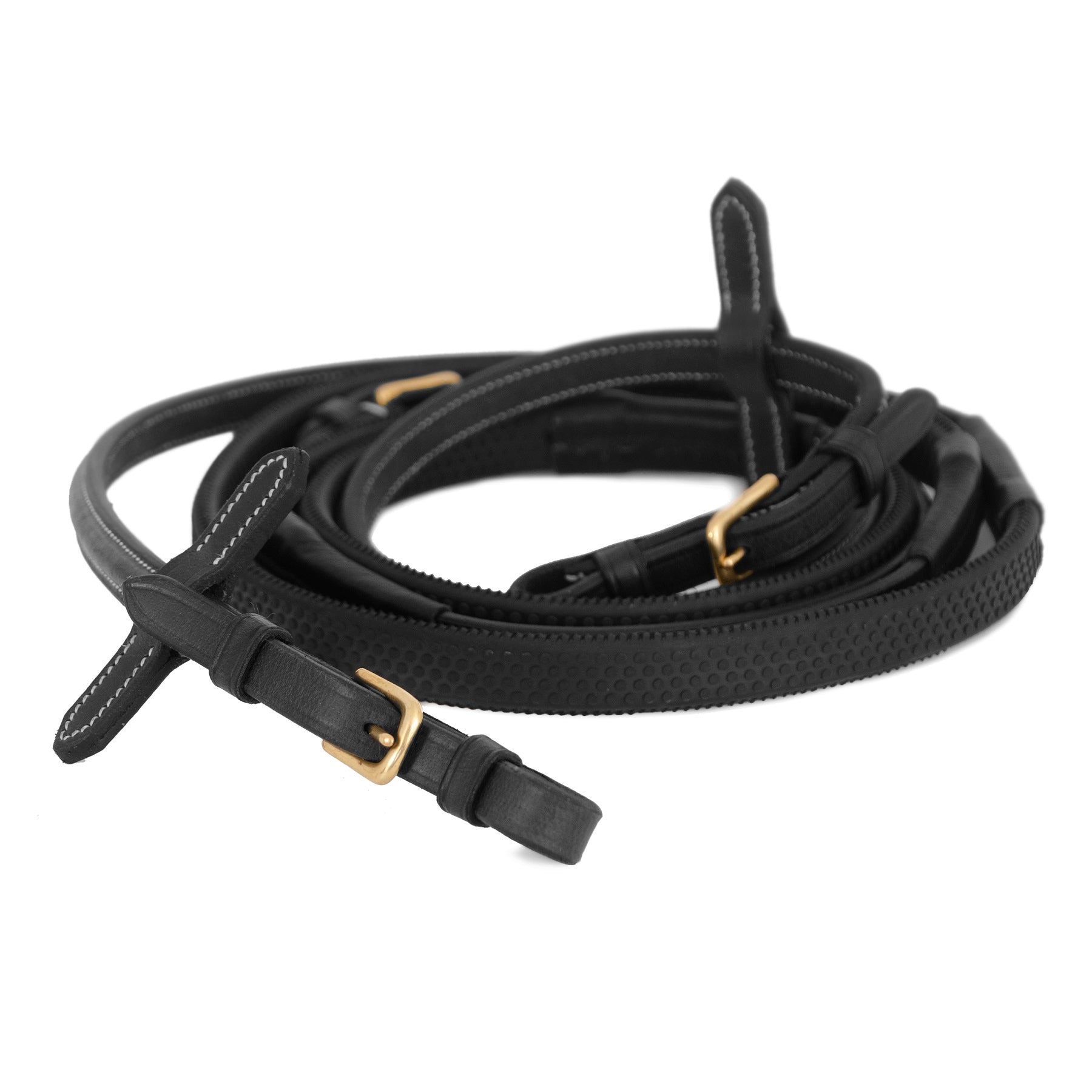 Mjuk och följsam gummitygel med bra grepp. Spännen i mässing och ljusa dekorsömmar.