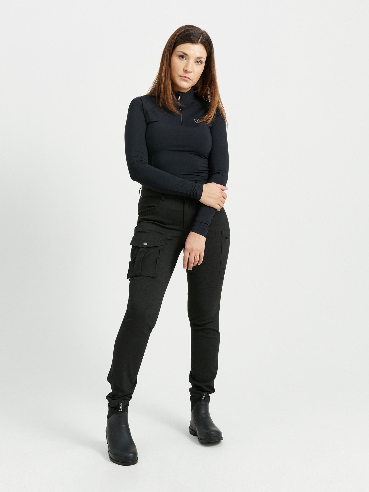Majken är stallbyxorna som är specifikt utformade för att möta behoven hos personer som arbetar i och runt stallet. De har flera fickor, både med och utan dragkedja, samt en förstärkt ficka avsedd för kniv eller sax. Oavsett om du rider, utför stallarbete eller bara vill ha en bekväm byxa för daglig användning, kommer vår stallbyxa med högt skuren midja att passa väl lämpat. Byxan har en avsmalnande benvidd som avslutas med resår vid ankeln, vilket gör att den kan användas tillsammans med ridstövlar. Den här har även en borttagen innerbensöm för att förhindra skav och ge dig optimal komfort under ridningen. Vi har valt att tillverka byxan i ett stretchigt Oeko-tex certifierat material, dessutom har byxan en lösare passform för att ge dig rörelsefrihet och bekvämlighet när du är aktiv i stallet. Om du föredrar en smalare passform rekommenderar vi att du väljer en mindre storlek än vad du normalt brukar ha. På så sätt får du en byxa som sitter åt mer och ger en slimmare look. Byxan har inte resår i midjan, men däremot en stretchig linning som ger ökad rörelsefrihet och förhindrar att midjan blir obekvämt hård. PASSFORM: Loose fit