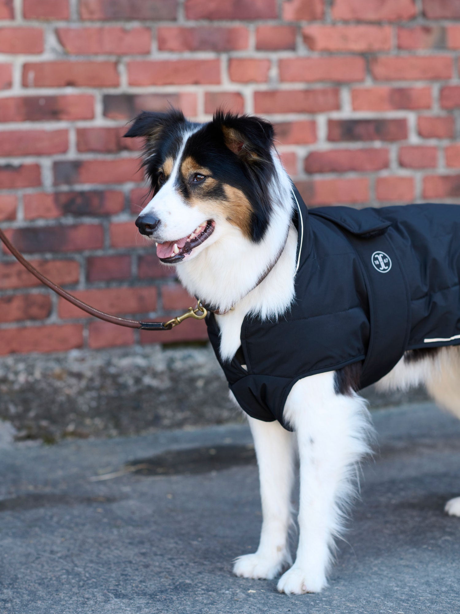 Vinterhundtäcke med dunliknande syntetfyllning. Återvunnen polyester, 5000mm vattenpelare/3000 MVP andasfunktion. Fodrad med softpile och praktisk magplatta som stängs med kardborre över ryggen. Justerbara elastiska bensnören. Reflexdetaljer.