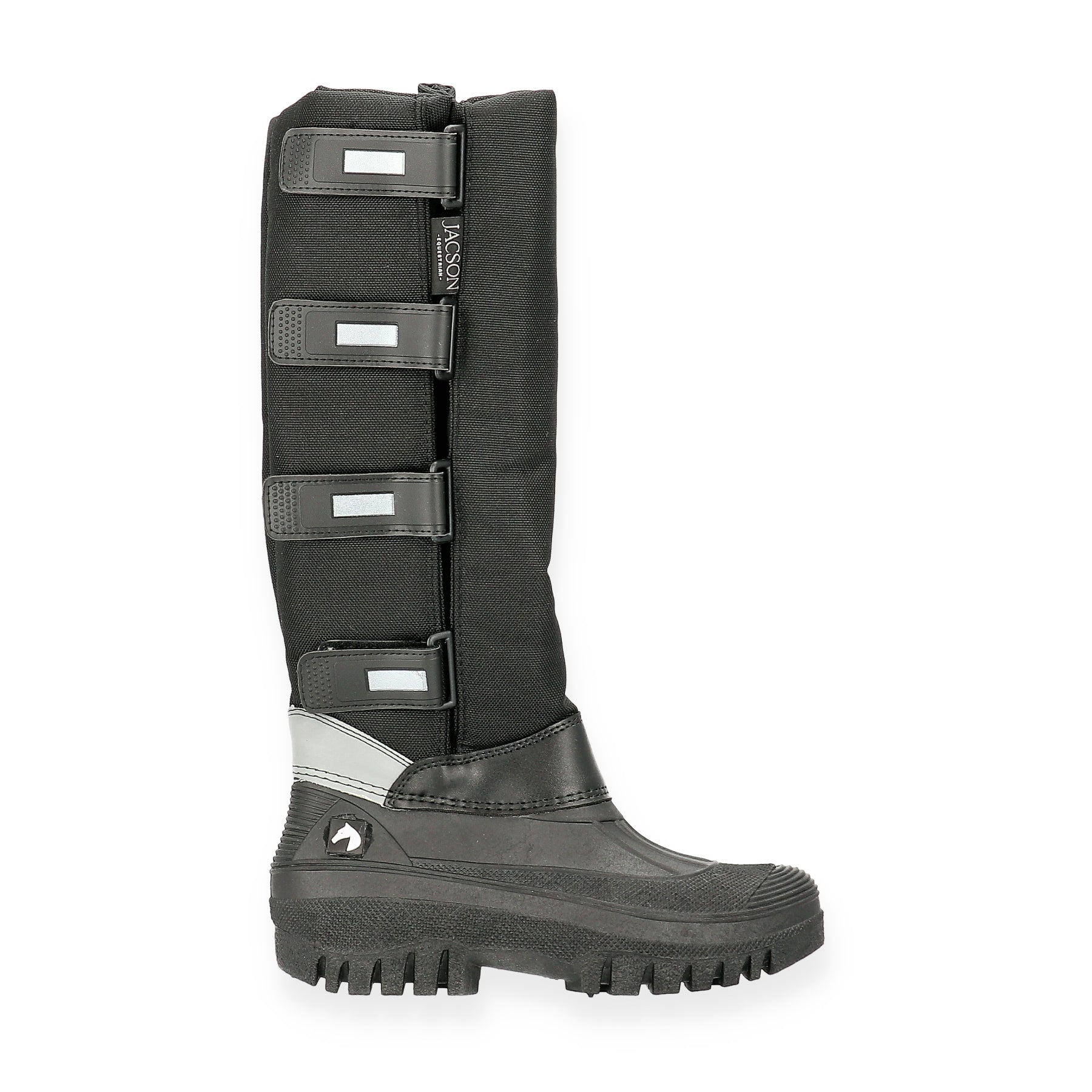 Varma thermoridstövlar med kardborreförslutning längs hela skaftet. Fotdel i helgjuten vattentät gummi. Reflekterande detaljer längs hela skaftet. Fodrade med syntetpäls.