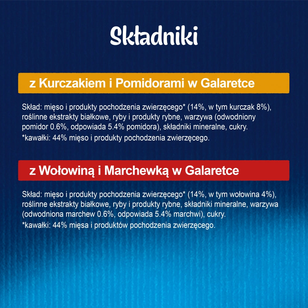 Med kyckling och tomater i gelé: Kött och djurprodukter* (14 %, varav kyckling 8 %), växtbaserade proteinextrakt, fisk och fiskprodukter, grönsaker (torkad tomat 0,6 % motsvarande 5,4 % tomat), mineralämnen, socker.
