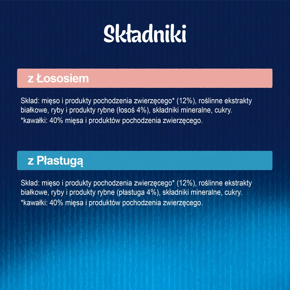 - Med Lax i Gelé: Kött och animaliska biprodukter* (12%), vegetabiliska proteinextrakt, fisk och fiskbiprodukter (lax 4%), mineraler, sockerarter