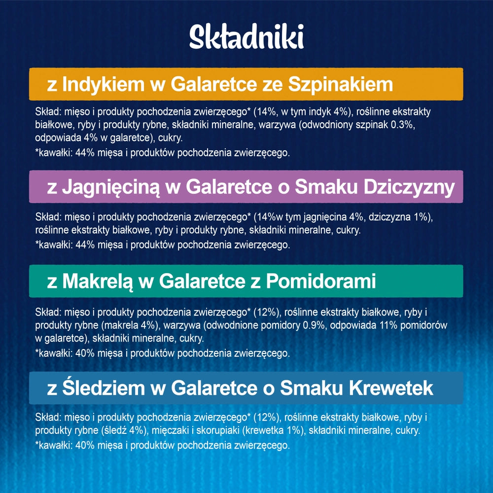 - Lamm i gelé med viltsmak: Kött och animaliska biprodukter (14%, varav lamm 4%, vilt 1%), växtbaserade proteinkoncentrat, fisk och fiskprodukter, mineralämnen, sockerarter.