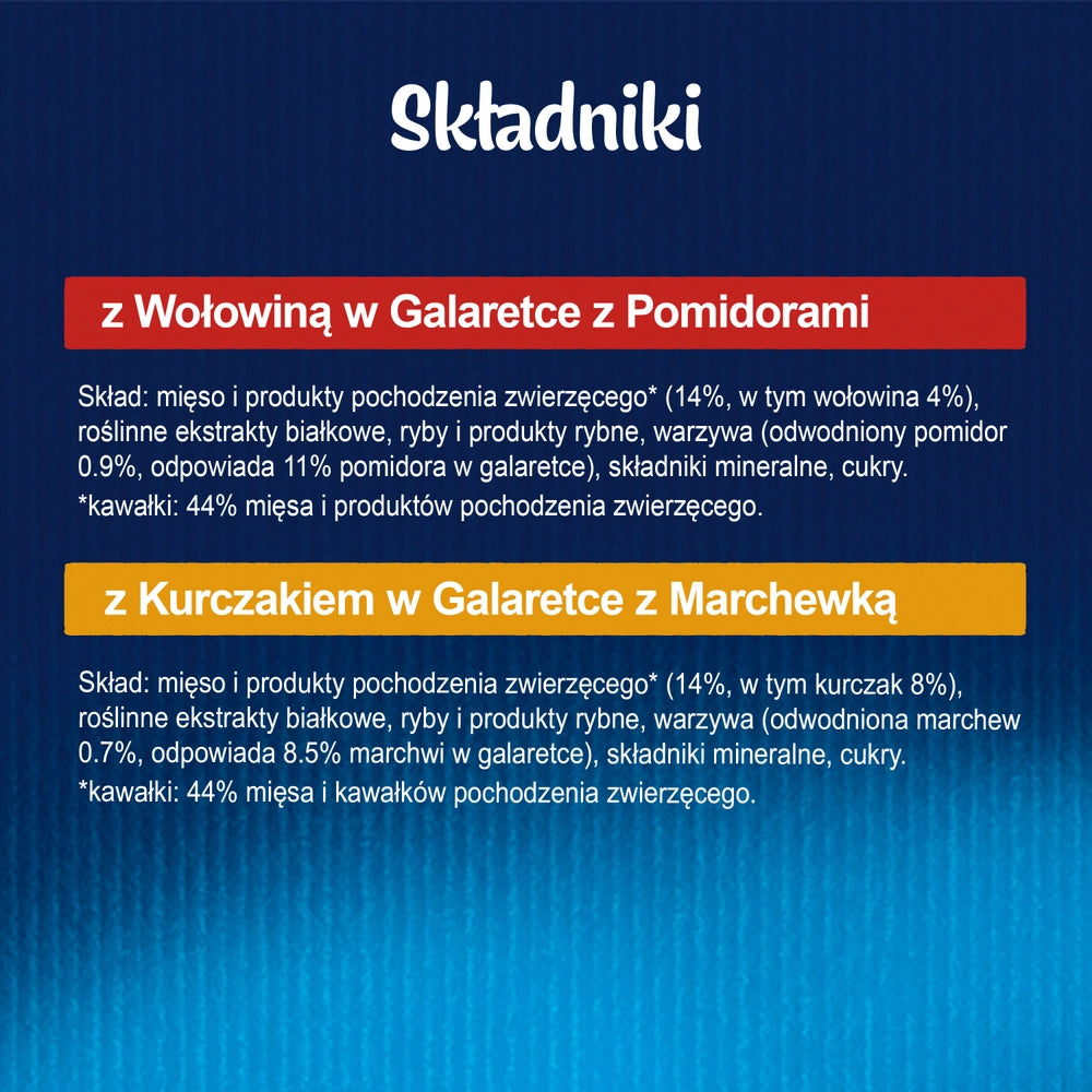 - 2 x Kyckling i morotsgelé: kött och animaliska biprodukter (14%, varav kyckling 8%), vegetabiliska proteinkoncentrat, fisk och fiskprodukter, grönsaker (torkad morot 0.7%, motsvarar 8.5% morot i gelé), mineralämnen, sockerarter.