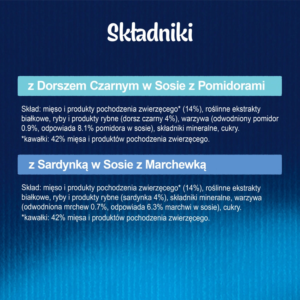 - Med sardiner i morotssås: Kött och animaliska biprodukter* (14%), vegetabiliska proteinkoncentrat, fisk och fisktillverkade produkter (sardiner 4%), mineralämnen, grönsaker (torkad morot 0,7%, motsvarande 6,3% morot i såsen), socker.