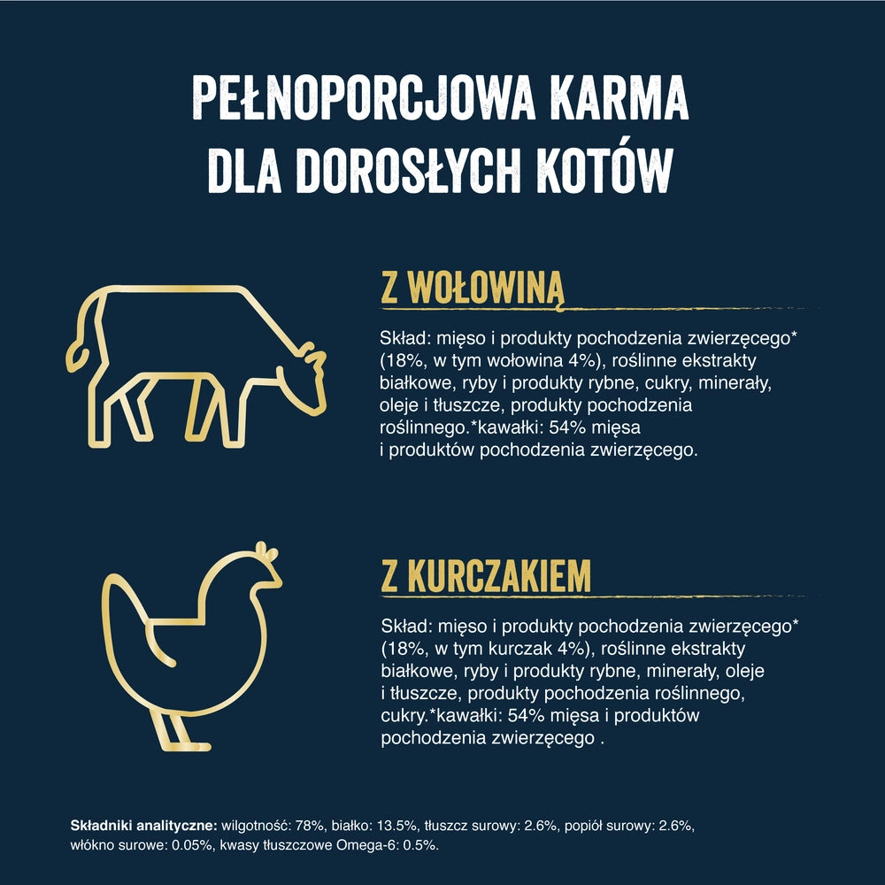 - Kyckling i sås: Kött och animaliska biprodukter* (18 %, inklusive 4 % kyckling), växtbaserade proteinkoncentrat, fisk och fiskprodukter, mineraler, oljor och fetter, växtbaserade produkter, sockerarter