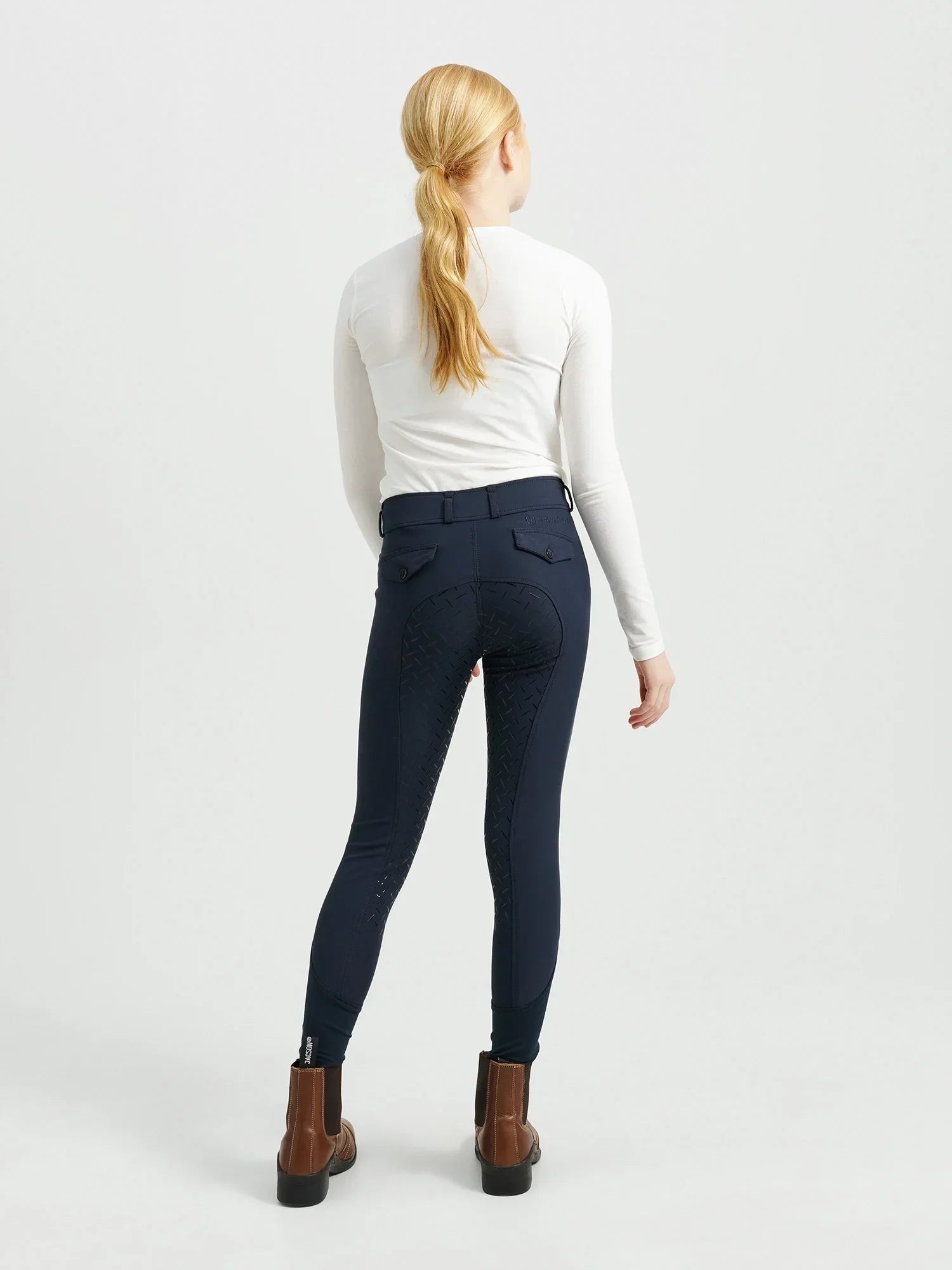 Jacson Barn Rigmor Ridbyxa är den perfekta ridbyxan för unga ryttare som vill ha både stil och funktionalitet i ett. Med en sadelkuren design och silicongrepp vid knäna , ger dessa ridbyxor optimalt stöd och komfort, oavsett om de används för träning eller tävling.
