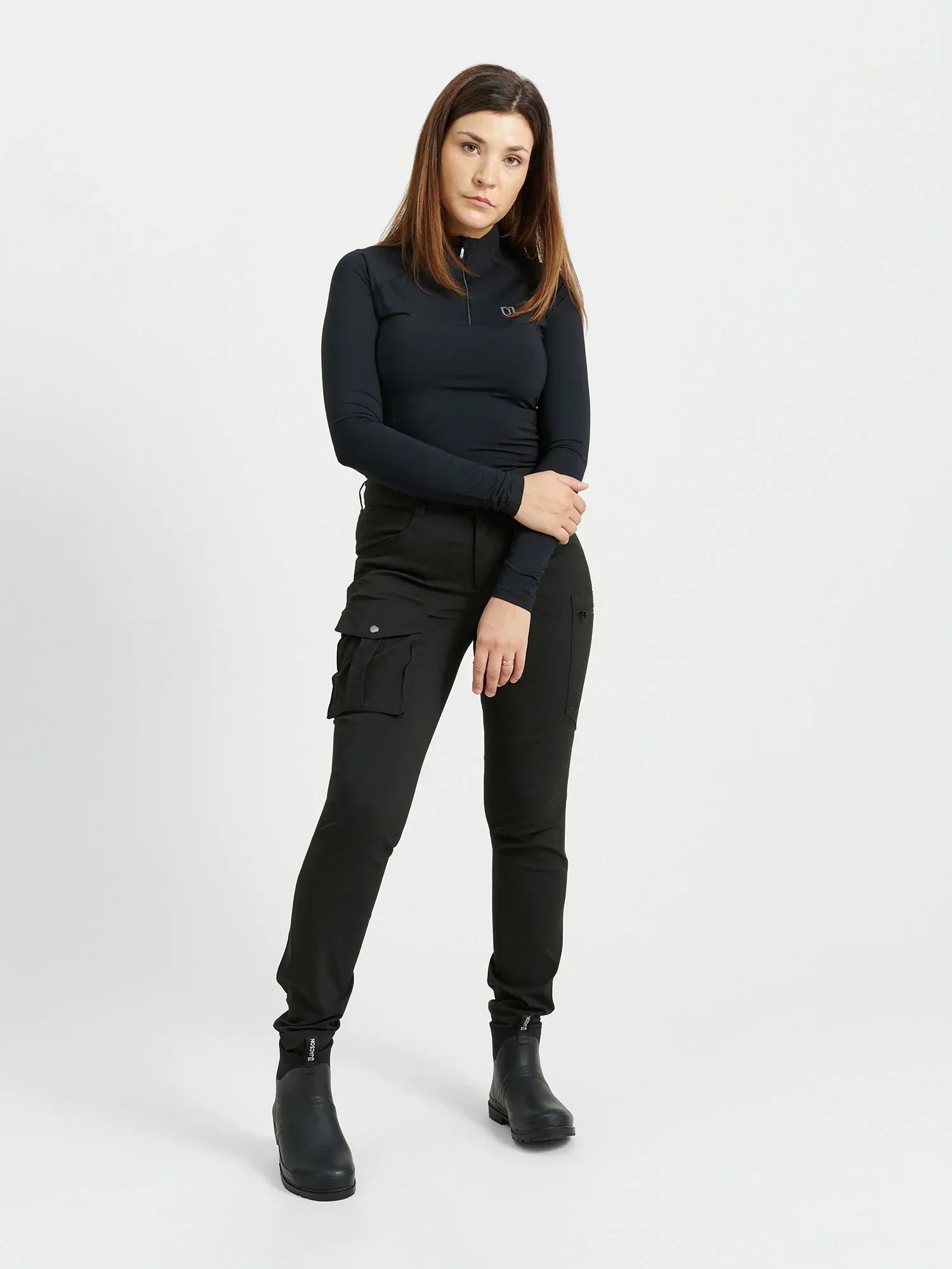 Oavsett om du rider, utför stallsysslor eller bara söker en bekväm byxa för vardagsbruk, erbjuder Majken en väl lämpat passform med sin högt skurna midja. Byxan har en avsmalnande benvidd som avslutas med resår vid ankeln, vilket gör dem idealiska att kombinera med ridstövlar. För att maximera komforten har vi tagit bort innerbensömmen, vilket minimerar risken för skav under ridning.