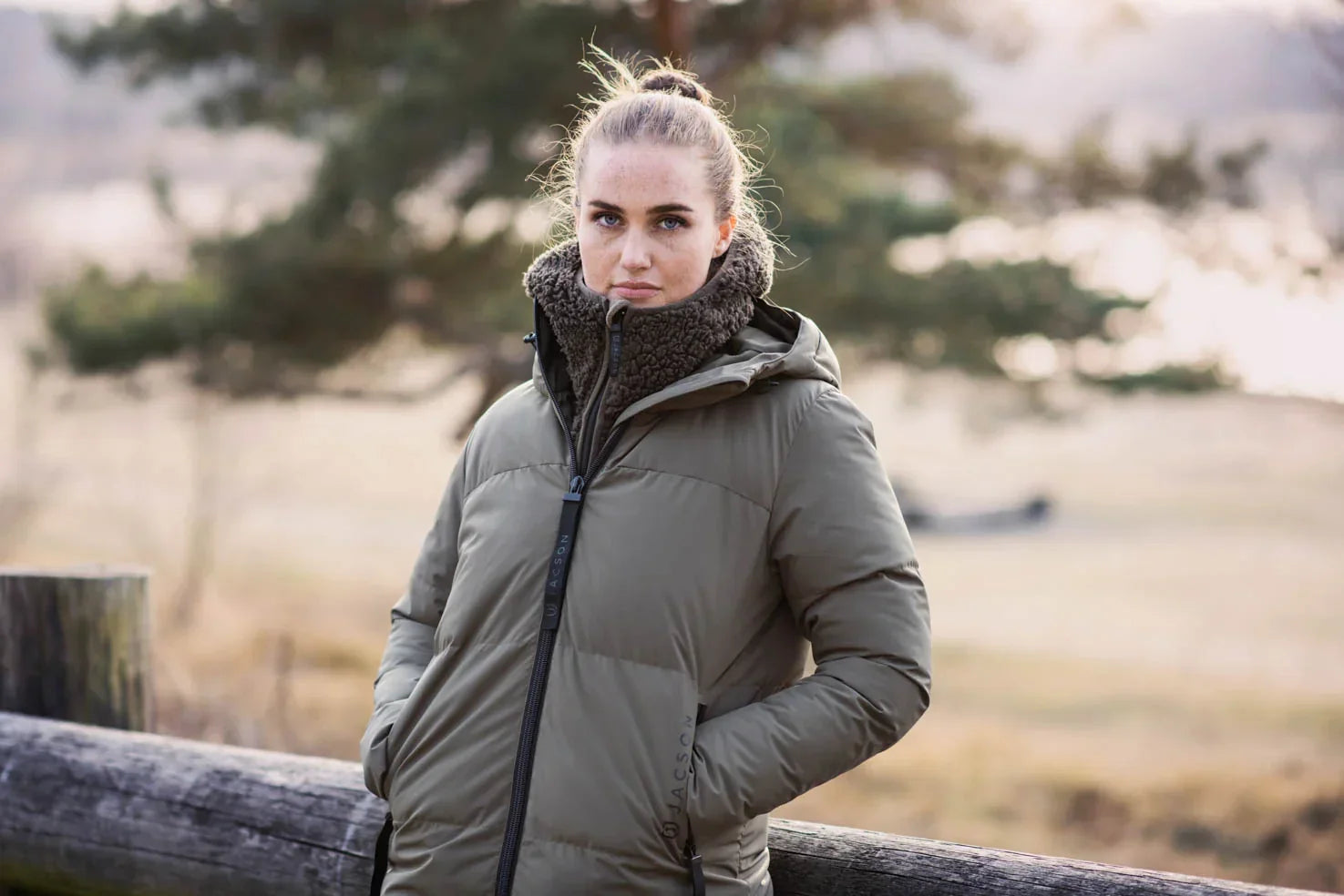 Upptäck vinterns trendigaste vinterkappa – Rakel ! Den här hellånga, raka kappa har en dunliknande syntetfyllning och finns i färgerna svart och brungrön. Rakel är tekniskt designad för att passa livet utomhus, oavsett om du sitter i sadeln, befinner dig i stallet eller på ridbanan. Kappan kombinerar praktiska funktioner med en hög modegrad, vilket gör den väl lämpat för den stilmedvetna ryttaren. Rakel är vattenavvisande och har en "andasfunktion", utan sömmar på axlarna för att förhindra att vatten tränger in. Den här lätt och varma fyllningen gör kappan idealisk för kalla dagar. Funktioner inkluderar en ridspund med dragkedja, dubbla skydd för dragkedjan, en tvåvägsdragkedja fram, fickor med dragkedjor och en innerficka. Muddar i ärmsluten och en stor huva som enkelt går över hjälmen gör den ännu mer praktisk. Kappan passar väl lämpat för ryttare, tränare, groomen eller föräldrar på läktaren. För att bevara fyllningens fluffighet, rekommenderas att torktumla på kort program med tennisbollar.