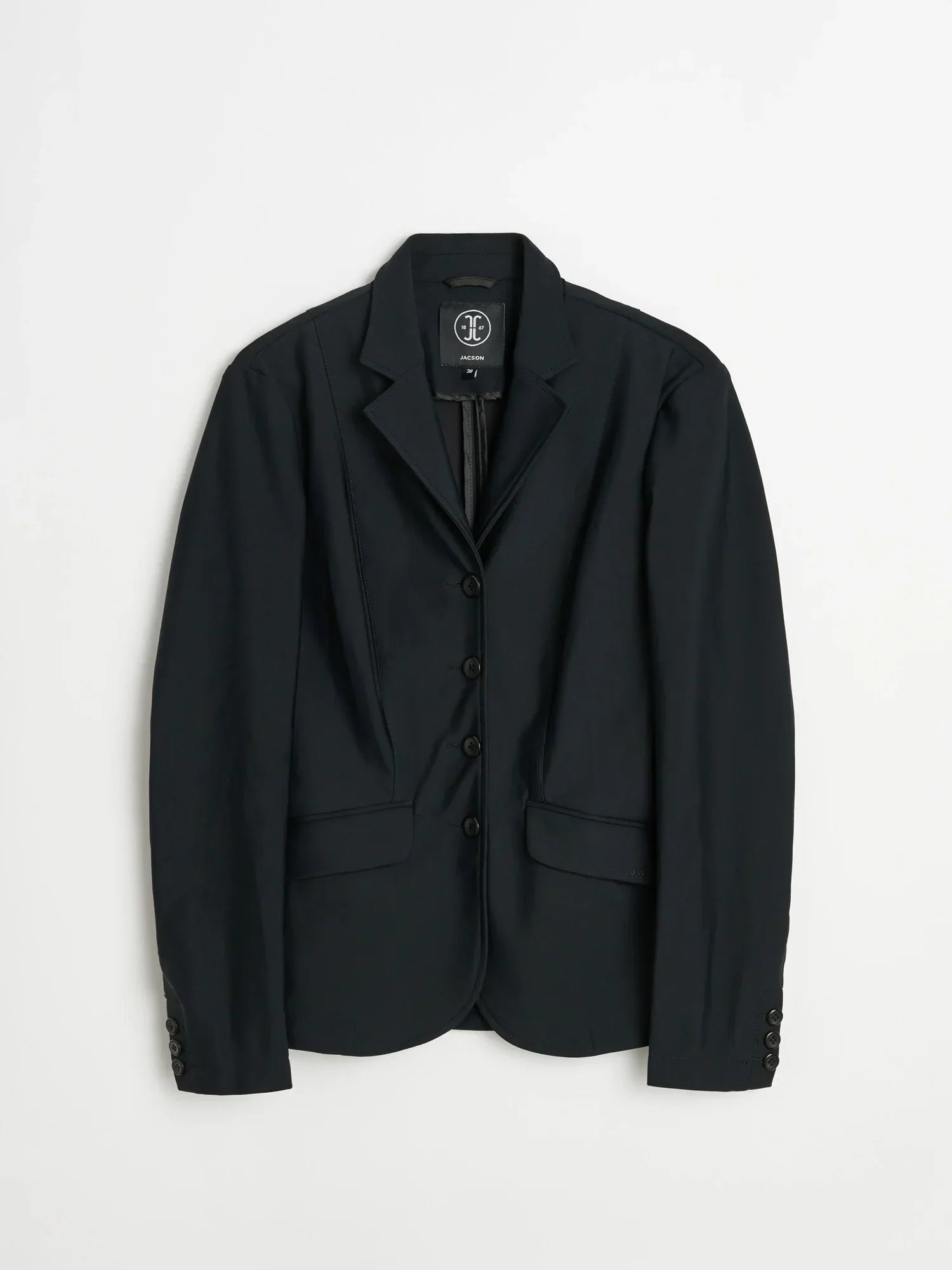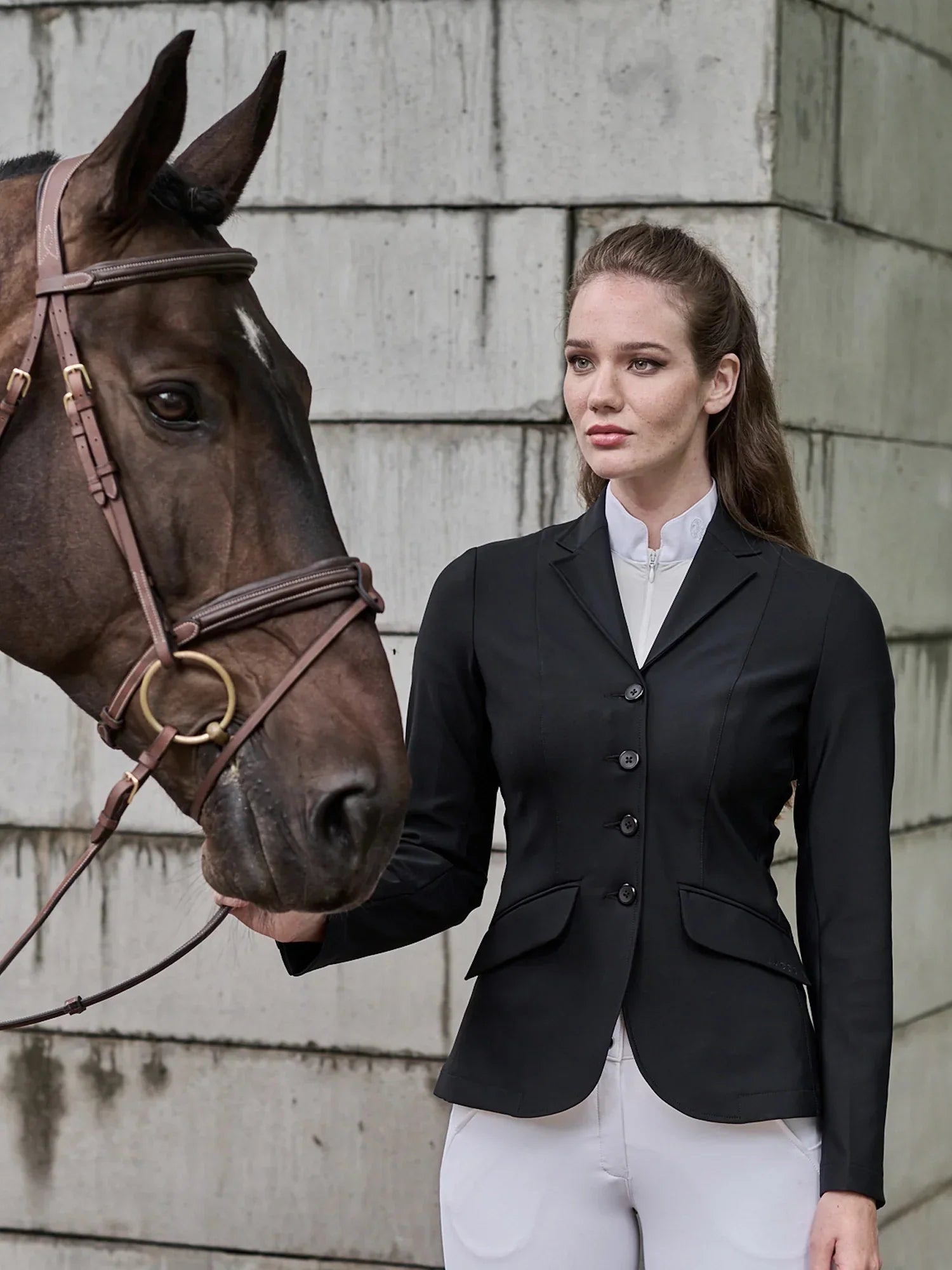 Jacson Solveig Tävlingskavaj Svart är den perfekta kavajen för den stilmedvetna ryttaren. Med sin figurnära passform och tekniska funktionsmaterial kombinerar den elegans med funktionalitet, vilket gör den idealisk för både träning och tävlingar.