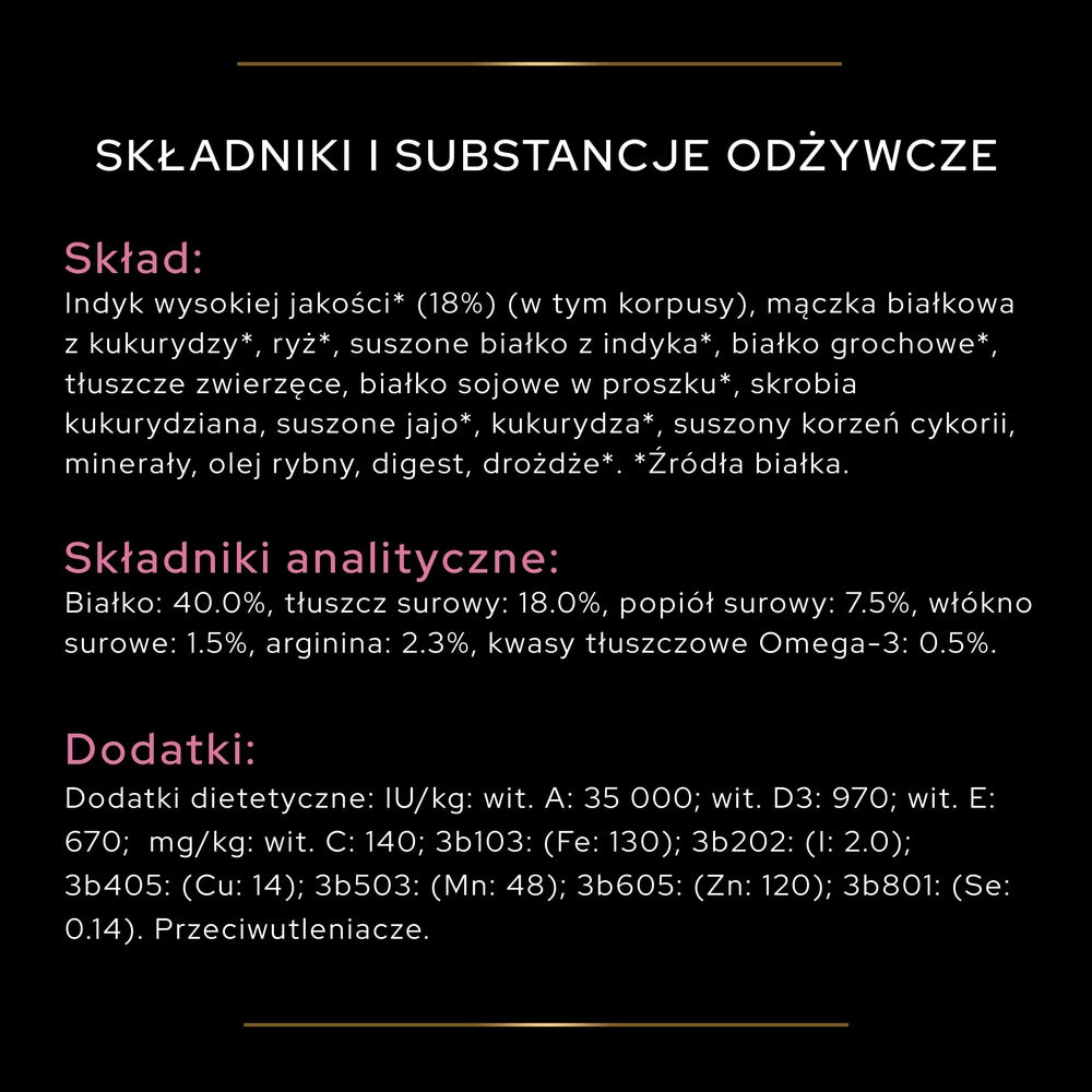 Kalkon av hög kvalitet* (18 %) (inklusive skrov), majsproteinmjöl*, ris*, torkat kalkonprotein*, ärtprotein*, animaliskt fett, sojaprotein i pulverform*, majsstärkelse, torkat ägg*, majs*, torkad cikoriarot, mineraler, fiskolja, digest, jäst*