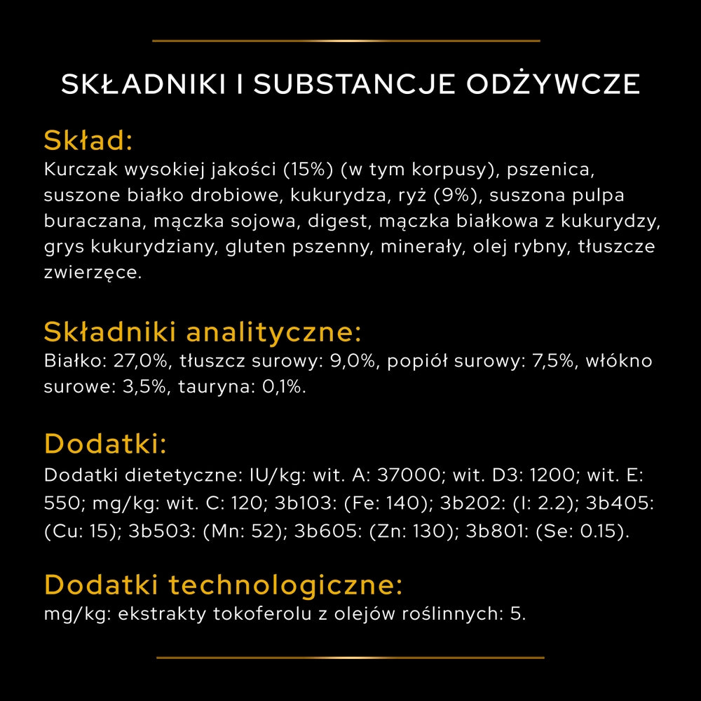 Högkvalitativ kyckling (15 %), vete, torkat fjäderfäprotein, majs, ris (9 %), torkade betmassor, sojamjöl, smältbarhet, majsproteinkoncentrat, majskross, vetegluten, mineraler, fiskolja, animaliska fetter.