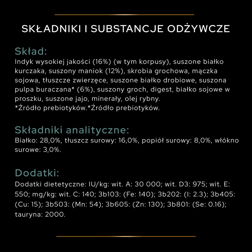 Skäm bort din hunds känsliga matsmältningssystem med den spannmålsfria formulan av PRO PLAN Sensitive Digestion. Denna exklusiva formula ersätter spannmål med maniok och andra ingredienser för att ge ett större urval av produkter anpassade för känsliga magar. Denna torrfodervariant från Purina PRO PLAN innehåller högkvalitativa bitar av kalkon som första ingrediens, tillsammans med lättsmälta ingredienser för att underlätta matsmältningen. Med vetenskapligt bevisade prebiotika ökar den mängden bifidobakterier för en bättre balans i tarmens mikroflora. Det höga proteininnehållet hjälper till att upprätthålla starka muskler och optimal kroppskondition, samt stödjer din fyrbenta väns utveckling.
