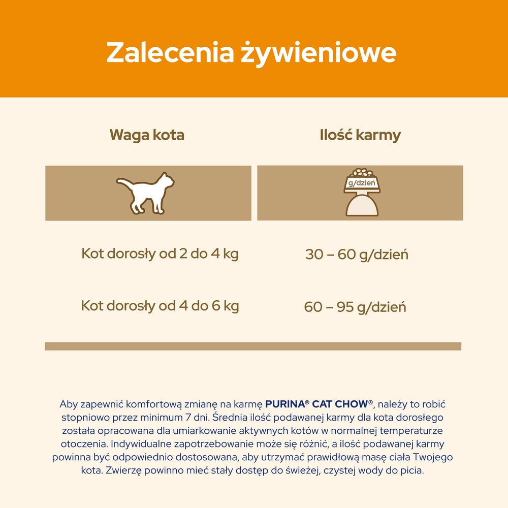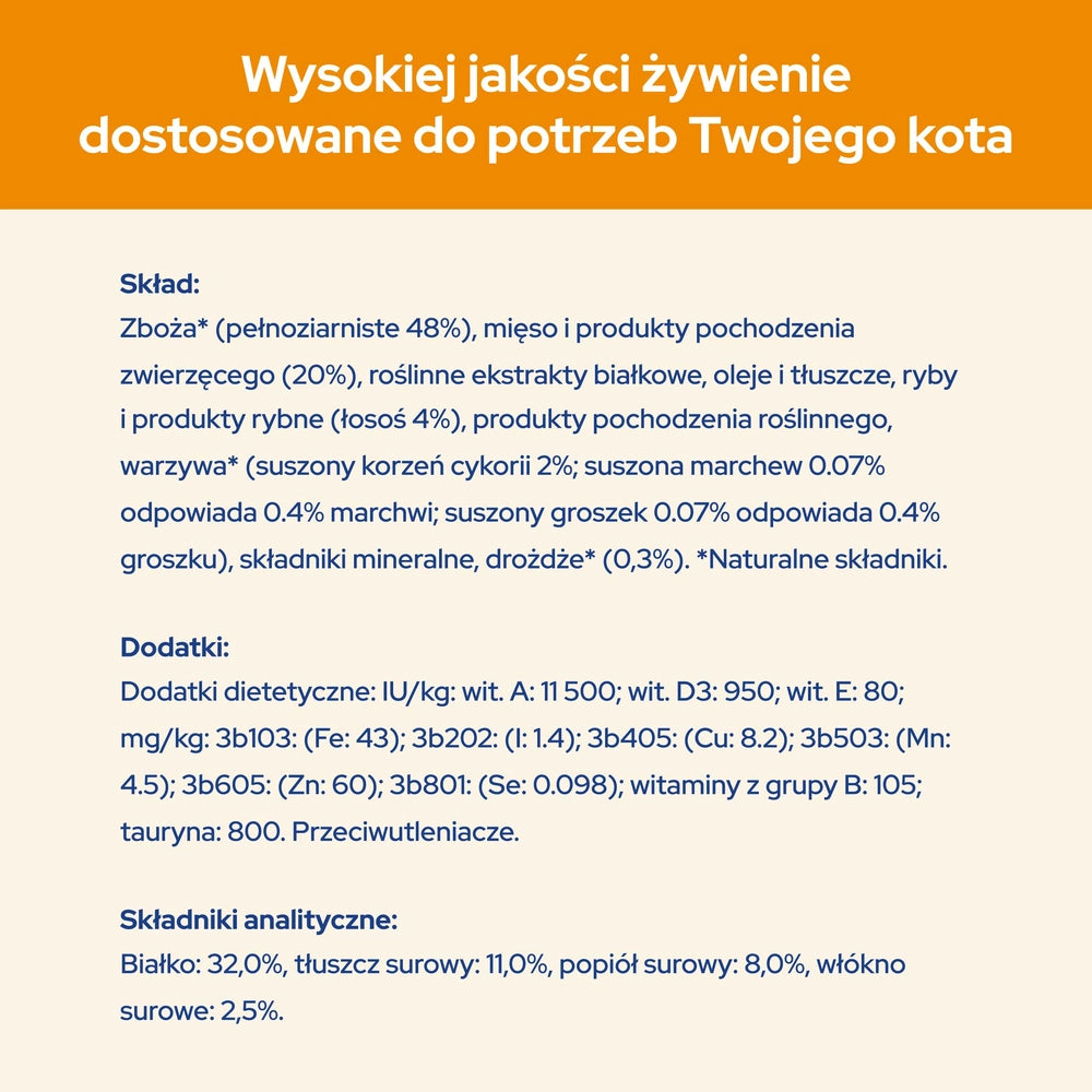 Purina® Cat Chow® Adult med Lax är ett komplett torrfoder som erbjuder ett utsökt smakäventyr samt främjar hälsan hos din vuxna katt. Fodret är speciellt framtaget för att passa behoven hos vuxna katter och innehåller hela 50% animaliskt protein. Delikata ingredienser såsom ärtor, morötter, fullkorn, cikoria och jäst skapar en balanserad och näringsrik sammansättning. Cikoria fungerar som en naturlig prebiotika och stödjer en hälsosam matsmältning, vilket hjälper din katt att dra nytta av varje måltid. Dessutom är fodret berikat med vitamin E för att stärka kattens naturliga immunförsvar samt B-vitaminer för att effektivt omvandla energi. Purina® Cat Chow® tillför inga artificiella färgämnen, smaker eller konserveringsmedel. Ge din katt en hälsosam och smakfull måltid med Purina® Cat Chow® Adult med Lax.