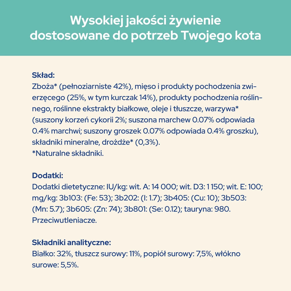 Purina® Cat Chow® Hairball Control med kyckling är det perfekta valet för din vuxna katt 🐱. Det kombinerar smakfull näring med hälsa för att uppfylla din katts naturliga behov. Torrfodret innehåller 50% av sitt totala protein från animaliska källor, vilket säkerställer högkvalitativ protein för din katt. De naturliga ingredienserna, såsom ärtor, morötter, fullkornsprodukter, cikoria och jäst, utgör en balanserad formel som gynnar din katt i hemmet 🐾🏠. Produkten är utvecklad för att hjälpa till med att reducera hårbollar, då dess fiberrika innehåll har visat sig avlägsna dubbelt så mycket hår från magen. Dessutom innehåller produkten cikoria som naturlig prebiotika för att främja en sund matsmältning 🌿. Njut av fördelen med en kost helt utan konstgjorda färgämnen, aromer och konserveringsmedel.