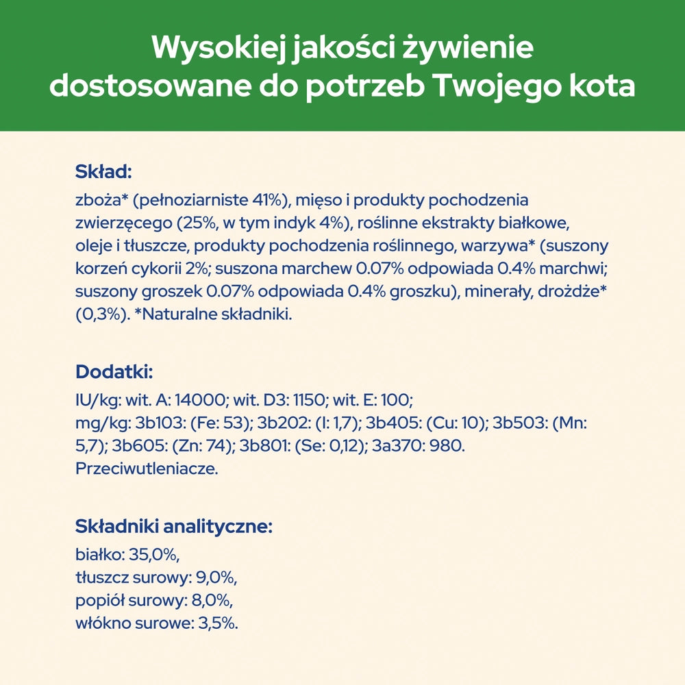 Purina Cat Chow är noggrant utvecklad med högkvalitativt protein och naturliga ingredienser som ärtor, morötter, fullkornssäd, cikoria och jäst. Denna kattmat är särskilt framtagen för steriliserade vuxna katter som behöver en balanserad kost. Med över 50 % av det totala proteininnehållet från animaliska källor, inklusive kalkon, möter den de naturliga behoven hos din katt. Receptet innehåller även cikoria, en naturlig källa till prebiotika som visat sig förbättra en sund matsmältning, vilket gör att katten kan dra nytta av mer från maten. Utan tillsatta konstgjorda färger, smaker eller konserveringsmedel, erbjuder detta foder en komplett och balanserad näring för att stödja din katts glada och friska liv.