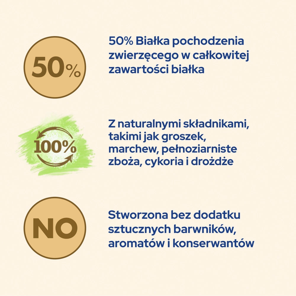 - Grönsaker* (torkad cikoriarot 2 %; torkad morot 0,07 % motsvarande 0,4 % morot; torkad ärta 0,07 %, motsvarande 0,4 % ärta)