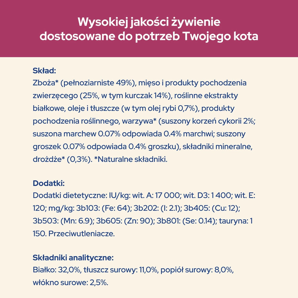 Purina® Cat Chow® Urinary Tract Health med kycklingsmak är ett komplett och balanserat torrfoder för din vuxna katt. Fodret är speciellt utformat för att stödja urinvägshälsan hos katter. Med 50% av det totala proteinet från animaliska källor uppfyller detta foder din katts naturliga behov. Lämpliga för katter i alla livsstadier, innehåller maten naturliga ingredienser såsom ärtor, morötter och cikoria. Cikorian fungerar som en naturlig prebiotika som främjar en hälsosam matsmältning, vilket optimerar näringsupptaget. Med tillsatt fiskolja bidrar detta foder till att minska inflammationsrisken i katternas urinvägar. Fodret är också fritt från konstgjorda färgämnen, smaker och konserveringsmedel.