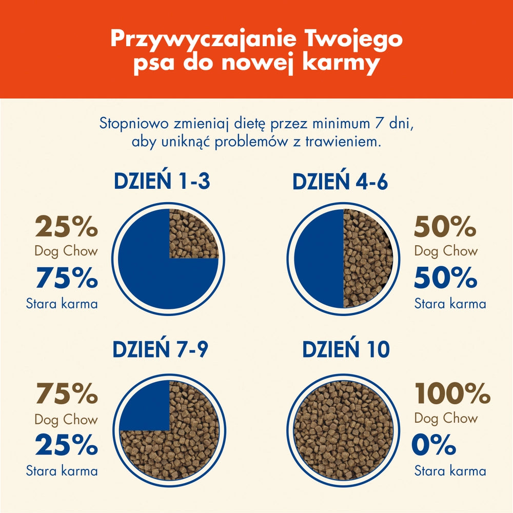 Justera mängden foder utifrån din hunds individuella behov för att upprätthålla en hälsosam och smal kropp. Se alltid till att färskt vatten finns tillgängligt för din hund. Introducera Dog Chow Active gradvis under en period av 7 dagar.