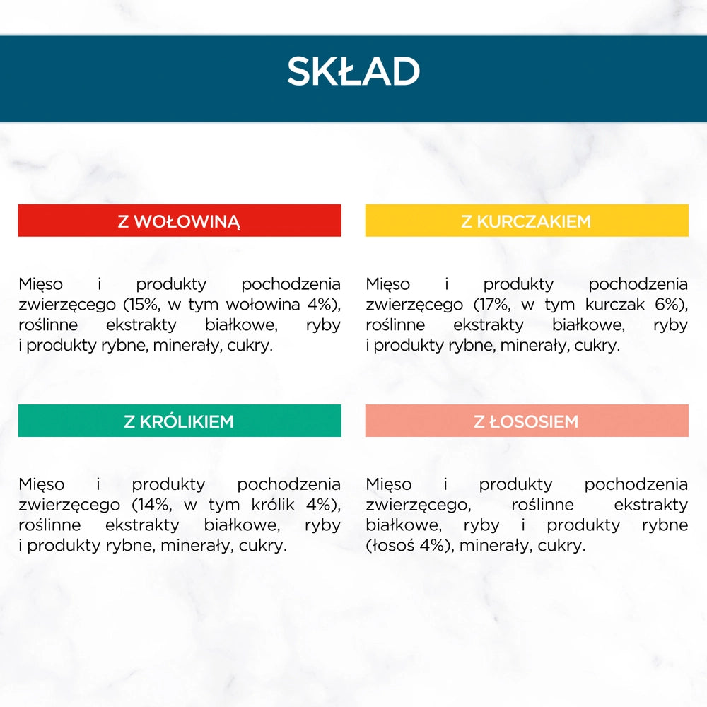 - Med kanin: Kött och animaliska biprodukter (14 %, varav kanin 4 %), vegetabiliska proteinextrakt, fisk och fiskbiprodukter, mineraler, sockerarter.
