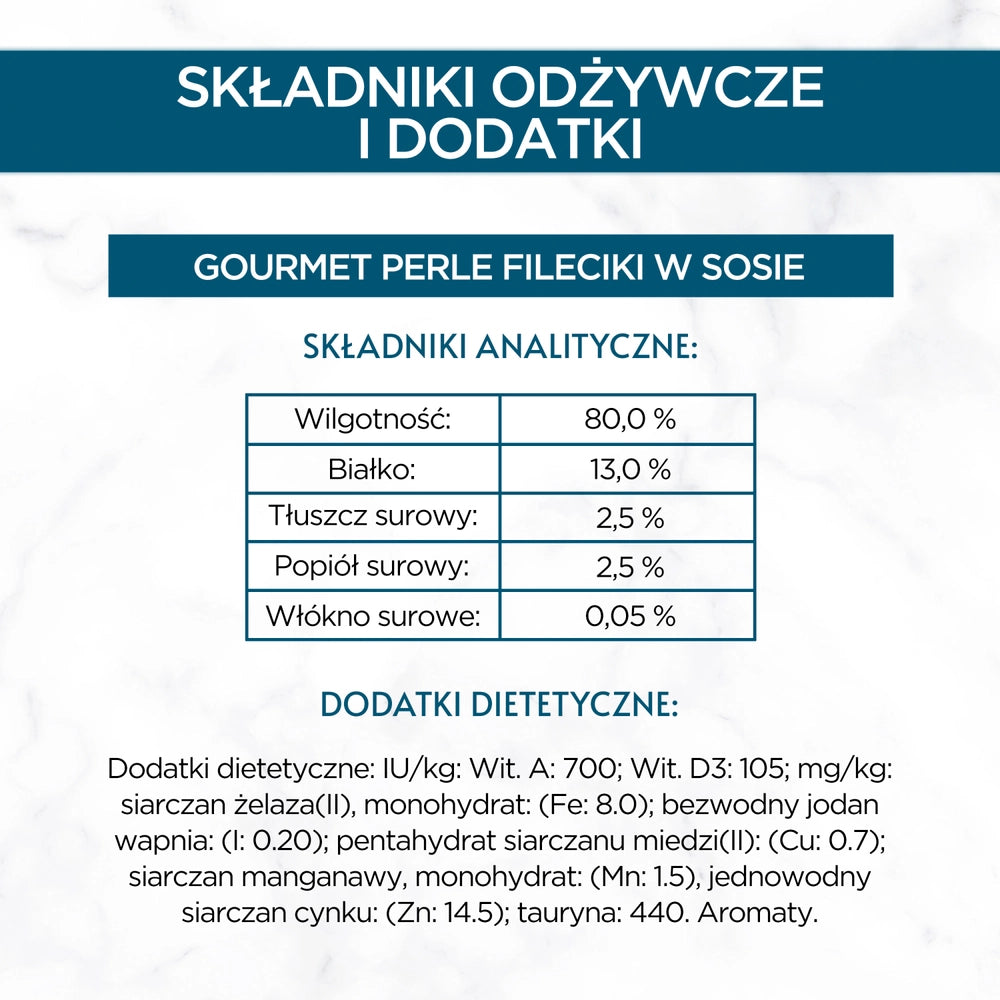 GOURMET™ Perle erbjuder en elegant frestelse för varje katts smaklökar varje dag. Denna kattmat är specialdesignad för vuxna katter och garanterar en fullständig och balanserad näringskälla. Produktens kännetecken är högkvalitativa ingredienser utan tillsatser av konstgjorda färgämnen, aromer eller konserveringsmedel, vilket garanterar att din katt får en naturlig och hälsosam måltid. Mini Filéerna med nötkött, kyckling, kanin och lax i sås är förmånliga genom sin smakrika och lockande presentation.
