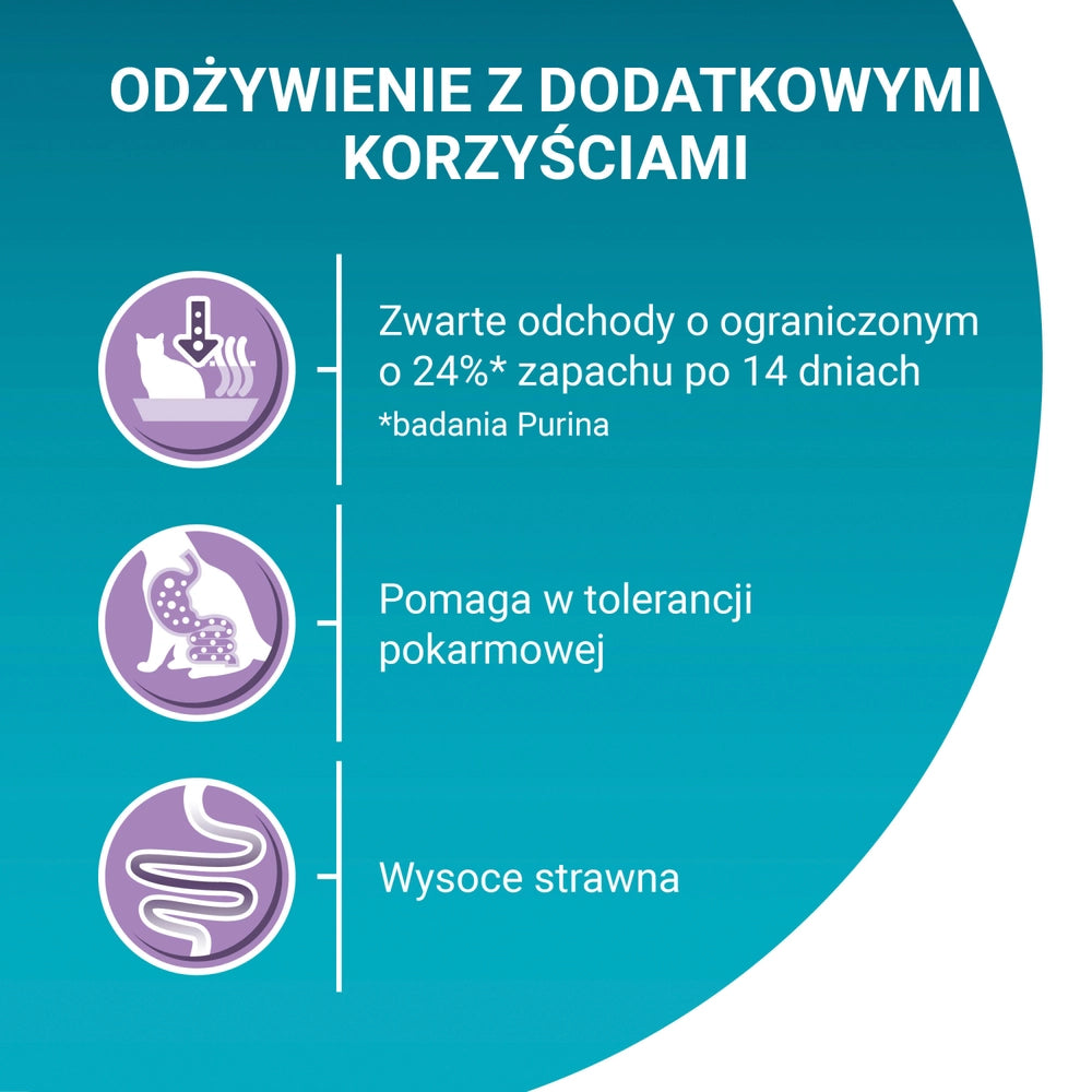 Detta foder bidrar dessutom till lättsmälta och kompakta avföringar genom sitt unika naturliga fiberinnehåll, vilket minskar luktintensiteten, och det är fritt från färgämnen och vetetillsatser för att stödja bättre foderintolerans. Allt detta är utvecklat av Purinas veterinärer och näringsexperter.