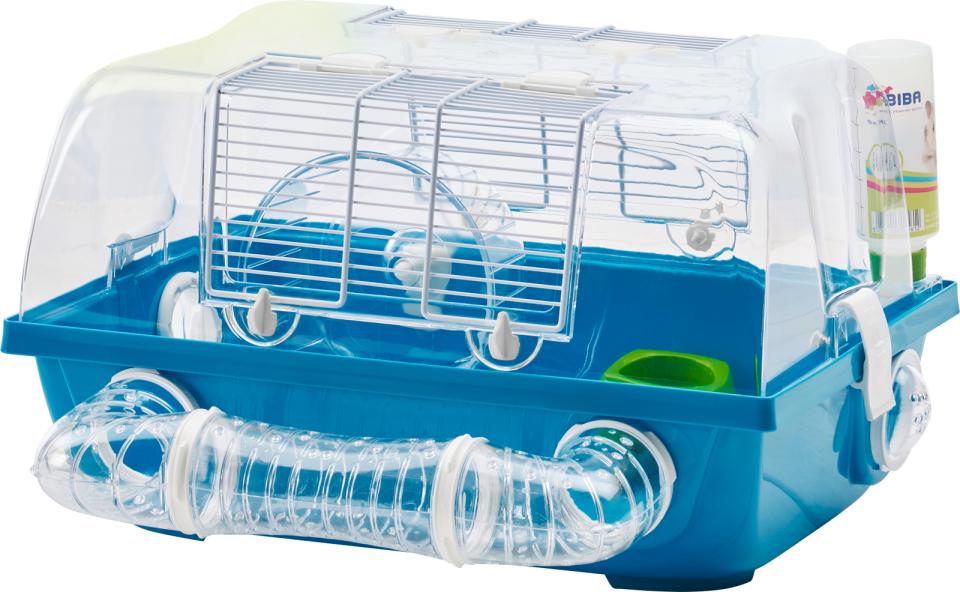 Bur till mus eller dvärghamster. Trots sin storlek medföljer en hel del ting för att aktivera den lille gnagaren, så som springhjul och tunnel som löper utanför buren. Även foderskål och vattenflaska ingår.